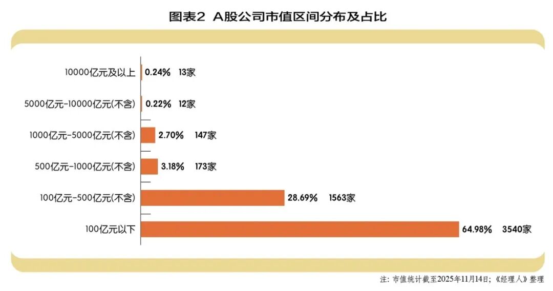 股市的上涨带动相关上市公司市值的提升,截至2025年11月14日,A股上市公司数量达到5448家,总市值已经突破100万亿元,达122.2万亿元,相较年初增加28.57万亿元,其中,万亿市值企业13家,千亿市值企业159家,两者合计占比3.16%。A股市场已连续多年稳居全球第二大资本市场的位置,不过,对比美国资本市场(截至2025年11月,美股总市值已突破72万亿美元)仍有巨大的成长空间。(图表2)