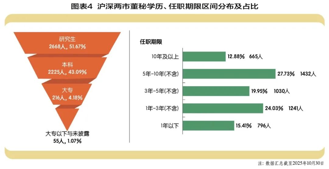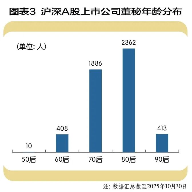 截至2025年10月,沪深两市共聘任超5000名董秘。他们的平均年龄为45岁,其中最大年龄为75岁,最小年龄为26岁。70后与80后是当前董秘职业的主力军,两者合计占据比例超八成,其次是90后,有413人,他们已经开始崭露头角,50后、60后仍有数百人坚守岗位。(图表3)从董秘性别分布来看,男性董秘仍然是多数派,占比超六成,但这些年女性董秘的数量在快速增长,两者的差距有缩小的趋势。